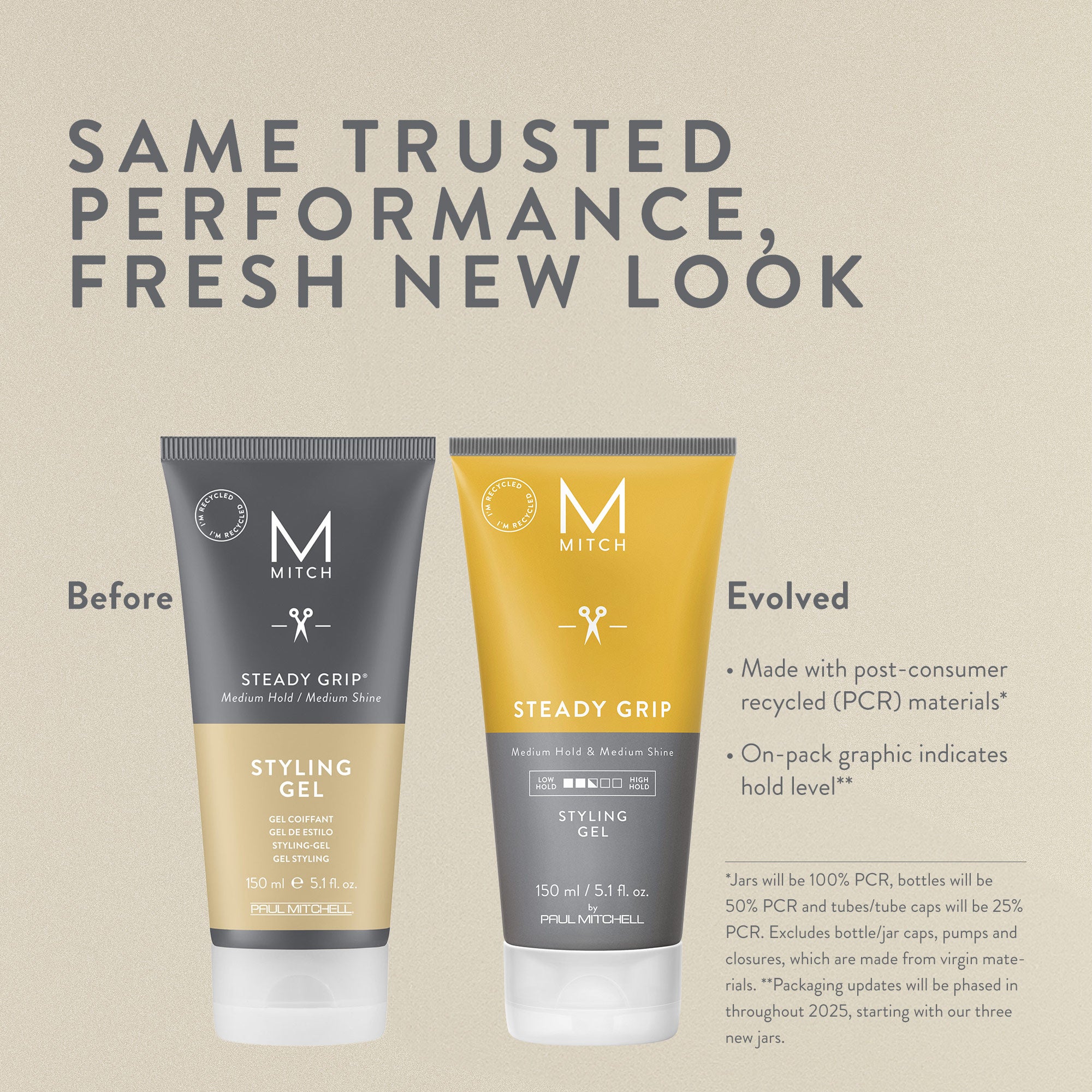 As part of our long-standing commitment to the environment, MITCH is packaged with post-consumer recycled (PCR) materials. Jars will be 100% PCR, bottles will be 50% PCR and tubes/tube caps will be 25% PCR.*